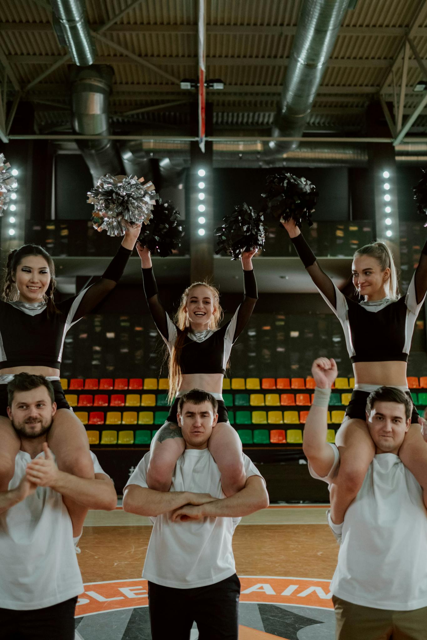 A man in a black coat smiles at an outdoor stadium, suggesting a sports event.